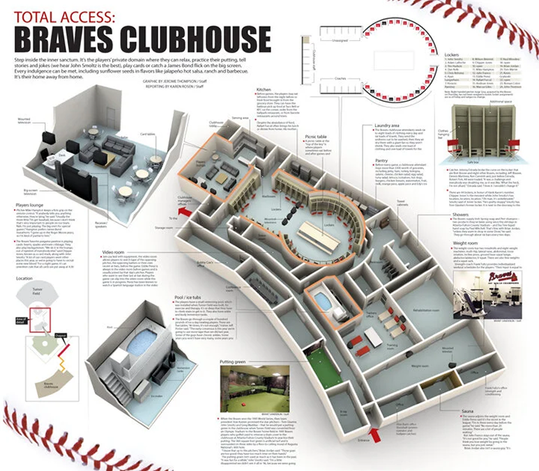 Providing an exclusive look at the Atlanta Braves clubhouse, this wildly popular two-page AJC spread offered fans a rare glimpse behind the scenes. I was granted unprecedented access to conduct interviews, gather technical data, and capture reference photography to build the detailed illustration. The project’s success extended beyond the paper, generating significant revenue through high-demand poster sales.